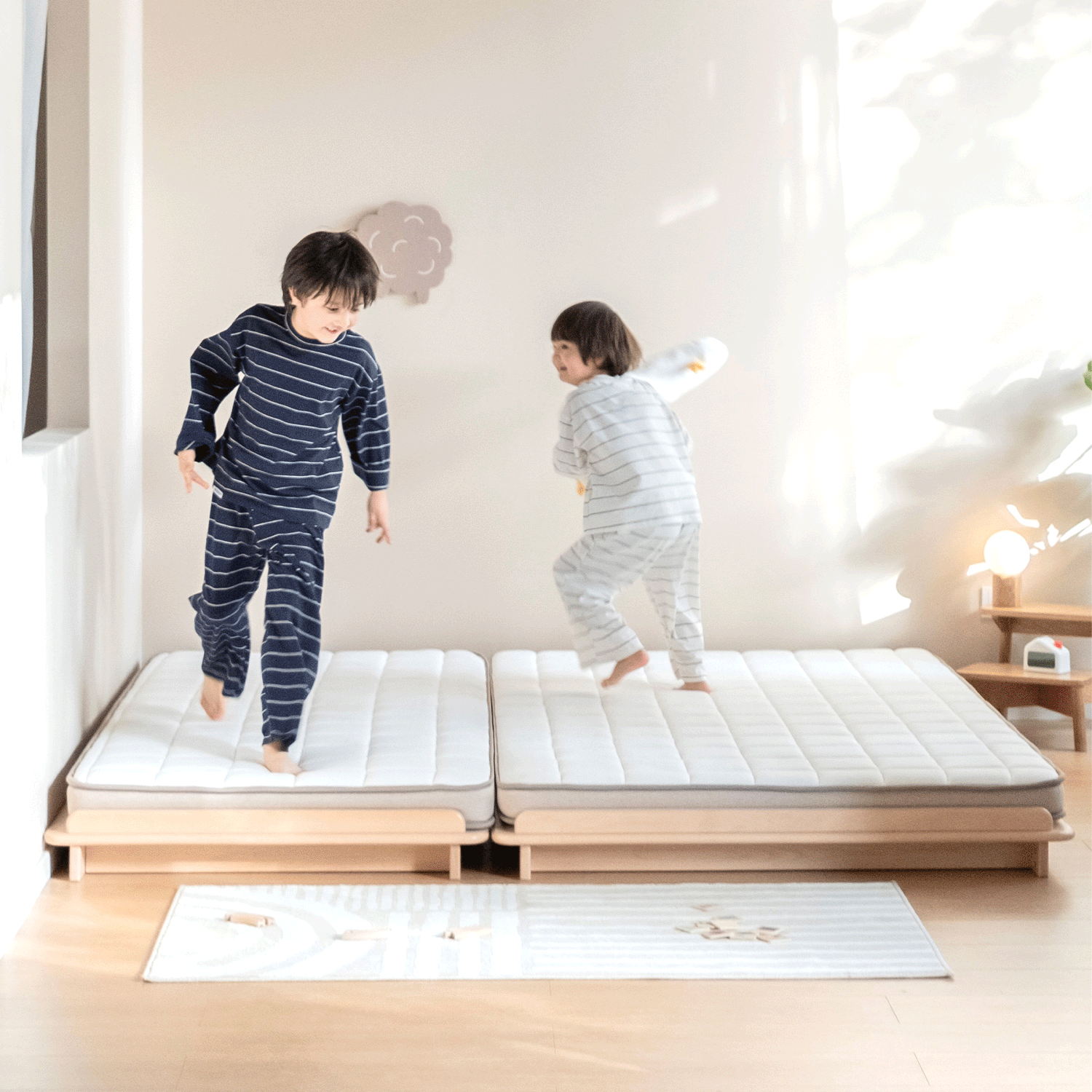 Need a custom fit for the whole family? A seamless Montessori floor bed that connects multiple sets for a huge family bed and elevates as they grow.