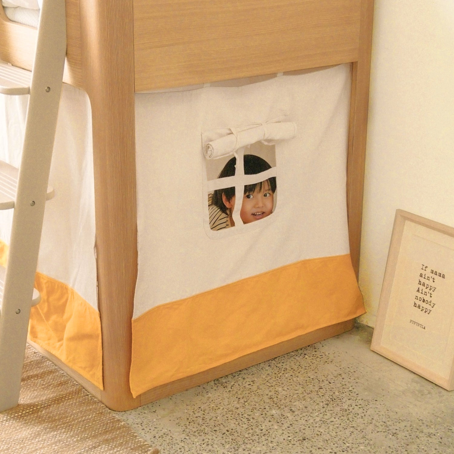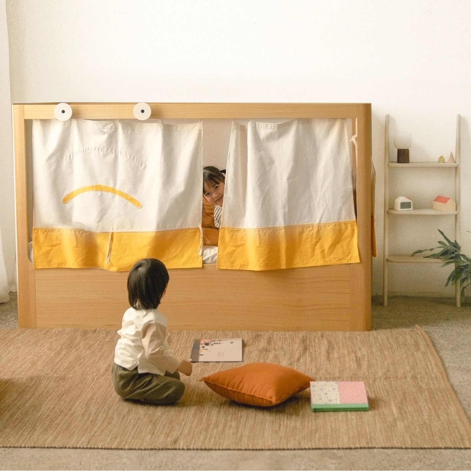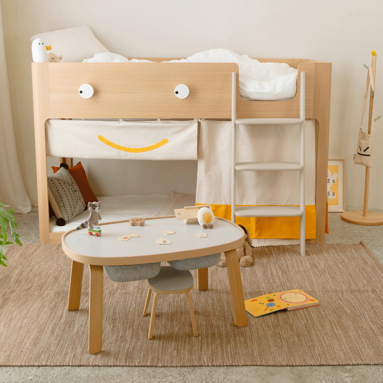 Give your child a private, cosy hideout under the loft bed. The curtains use expressive faces to help your child communicate: closed means "Leave me alone", and open means "Let's play together". It’s a fun way to encourage emotional expression and imagination.