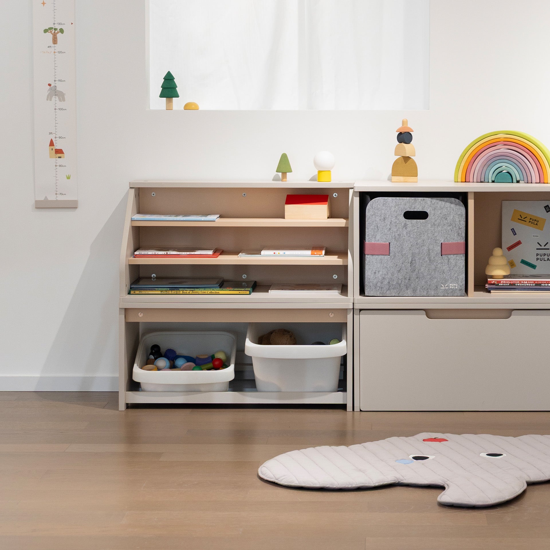 This cabinet is part of a versatile modular system that expands with your family. Start with a single unit for a toddler, then add more cabinets sideways to create a wider play area, or stack them vertically for older children. It is the sustainable solution that will seamlessly last for years.