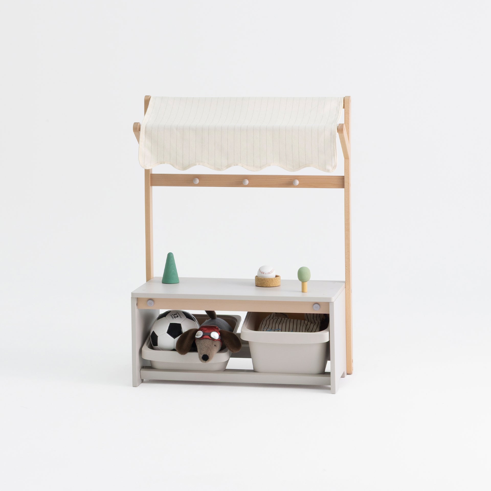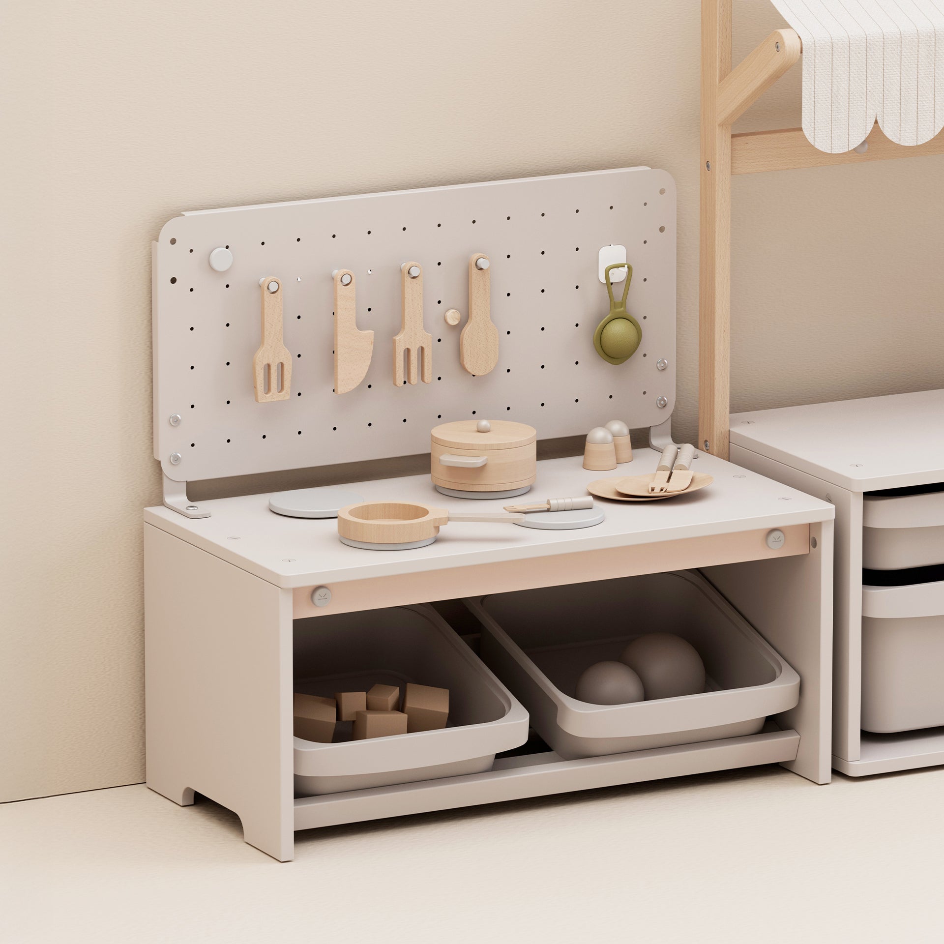 This cabinet is part of a versatile modular system that expands with your family. Start with a single unit for a toddler, then add more cabinets sideways to create a wider play area, or stack them vertically for older children. It is the sustainable solution that will seamlessly last for years. Integrate with a Play Shop Stand and Clothes Rack to transform the storage unit into a fun and imaginative zone.