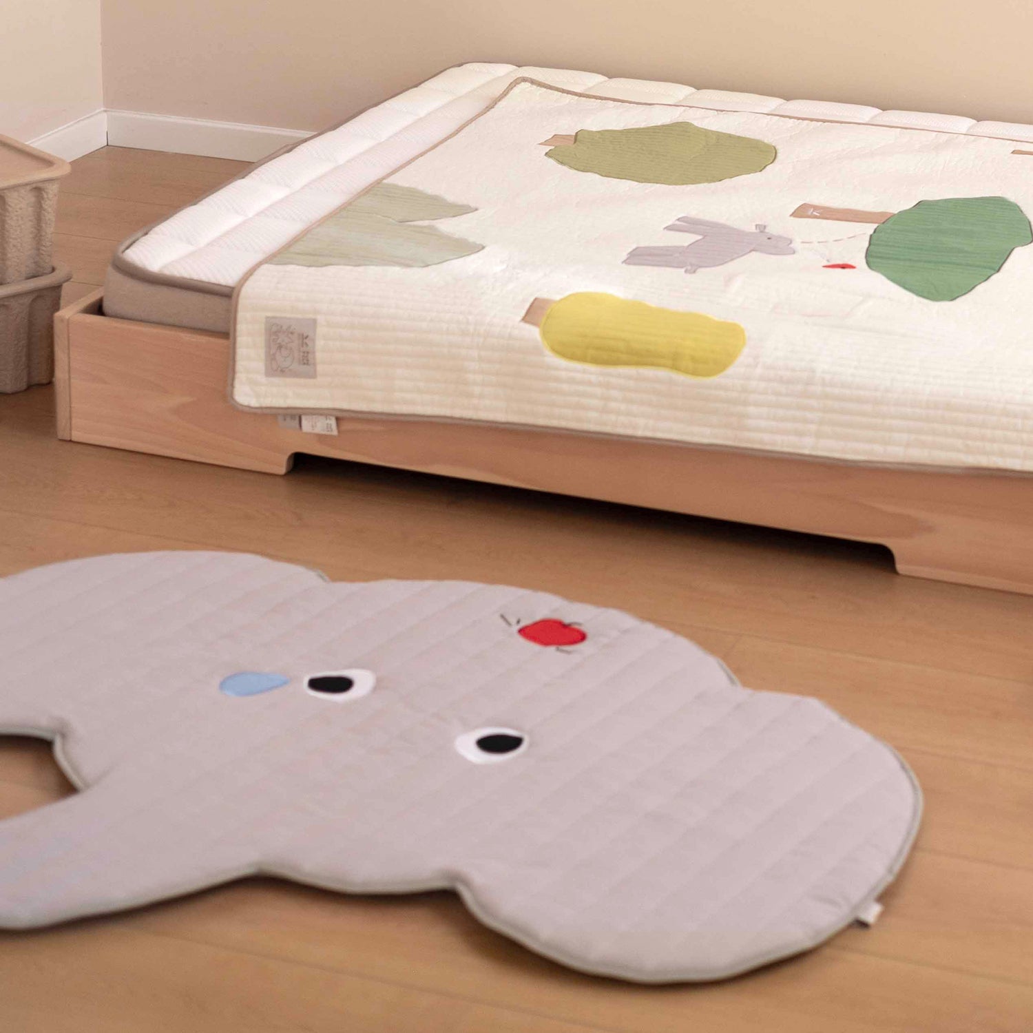 A quick flip is all it takes to change the look of the room. This double-sided playmat features two delightful expressions: the whimsical "Hit by Apple" elephant and the charming "Eye Roll" design. It’s an easy way to refresh your space with a touch of playful style.