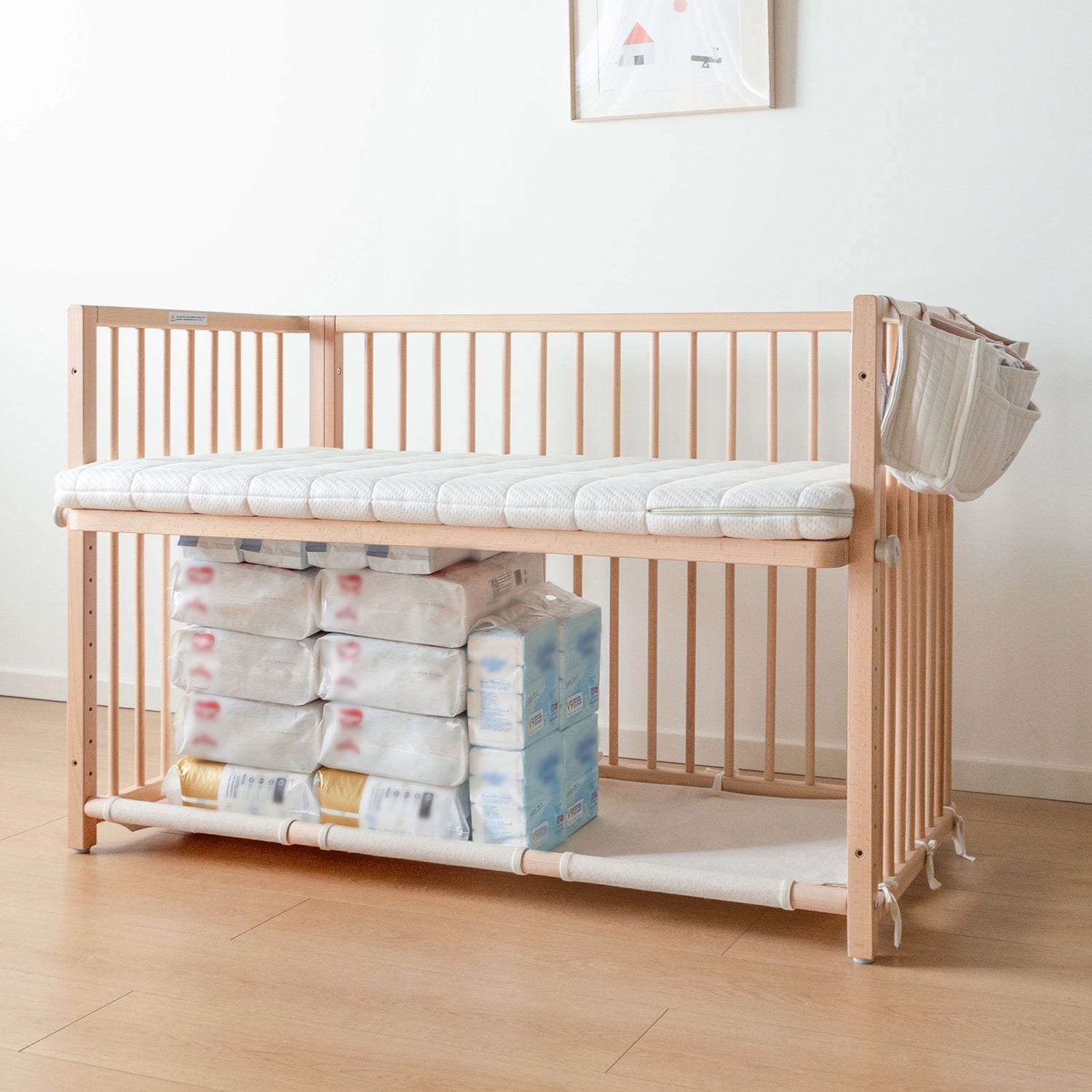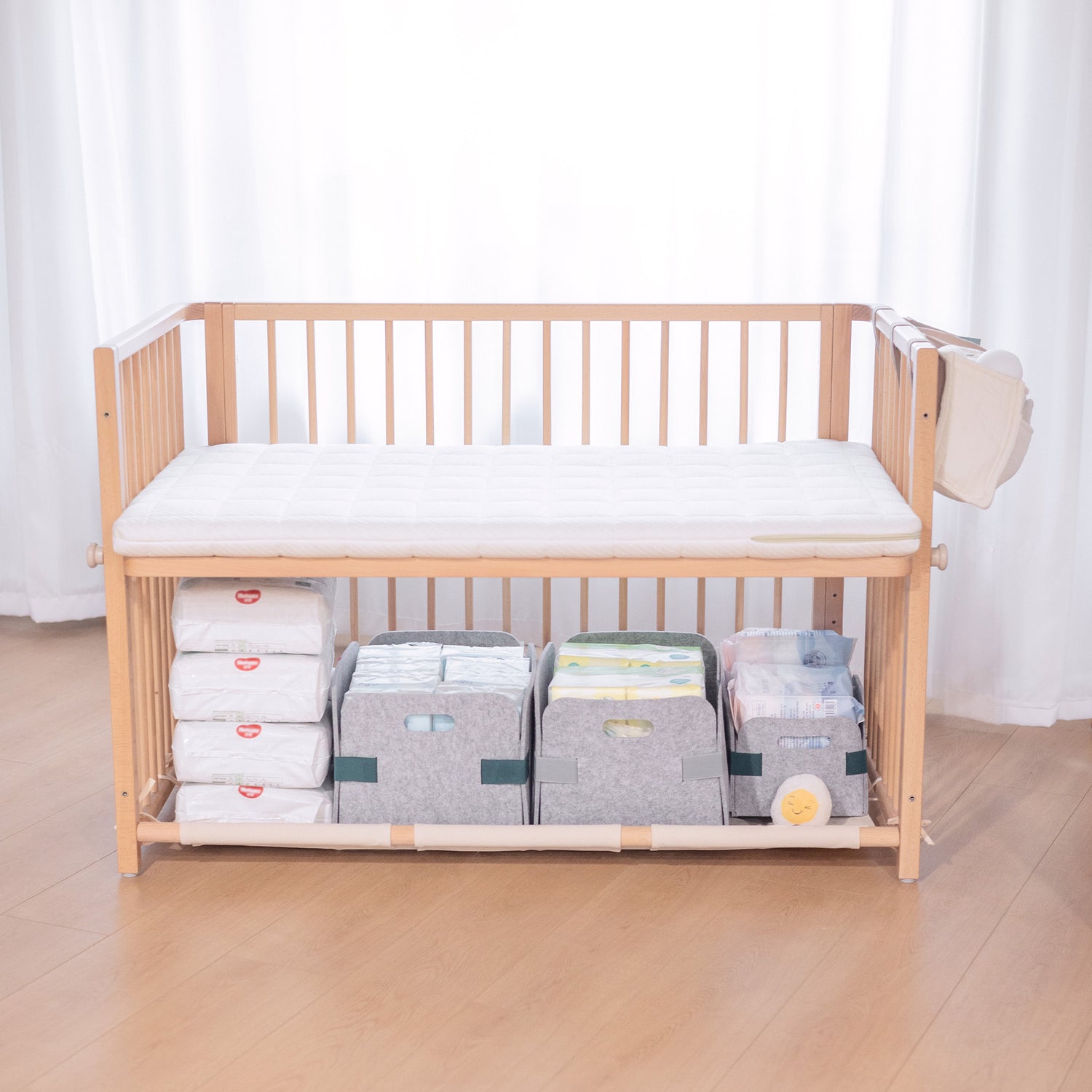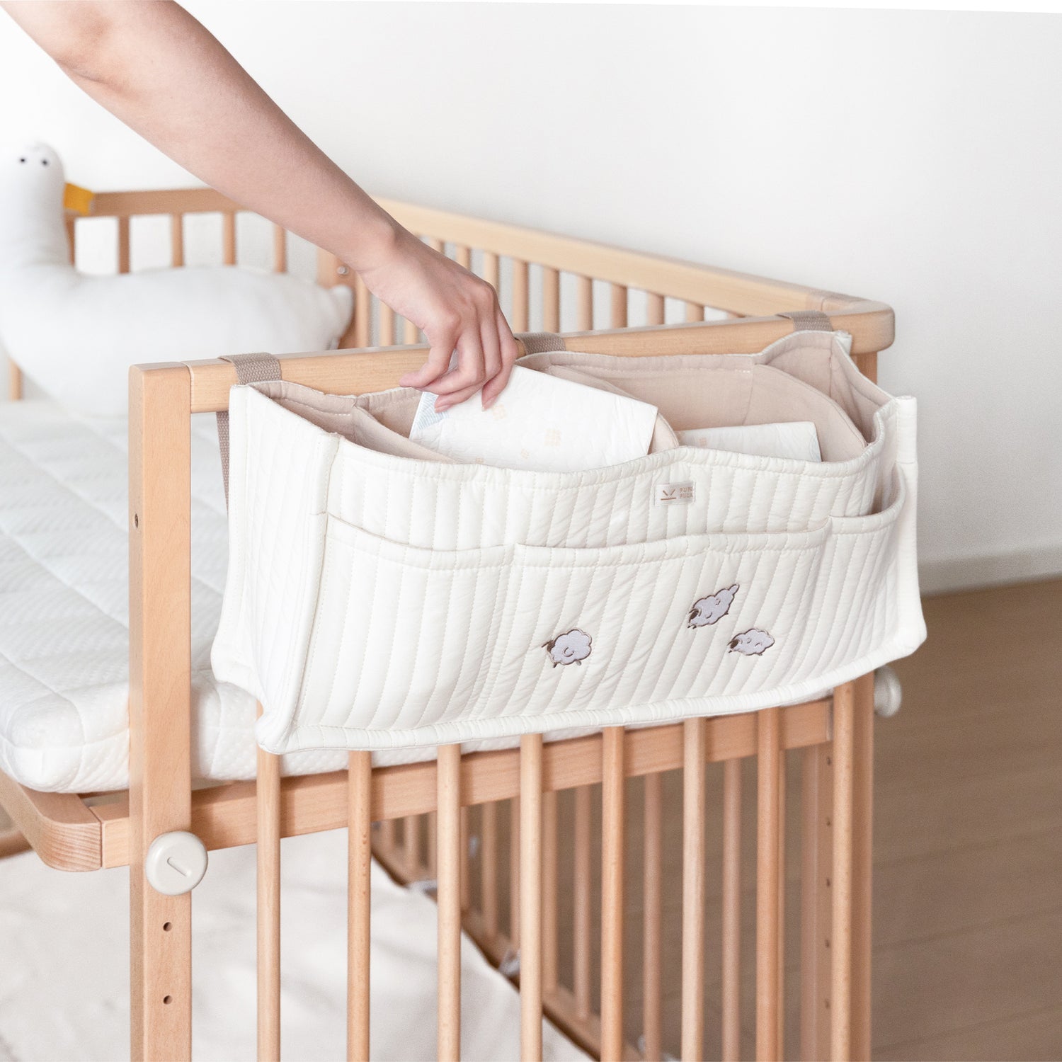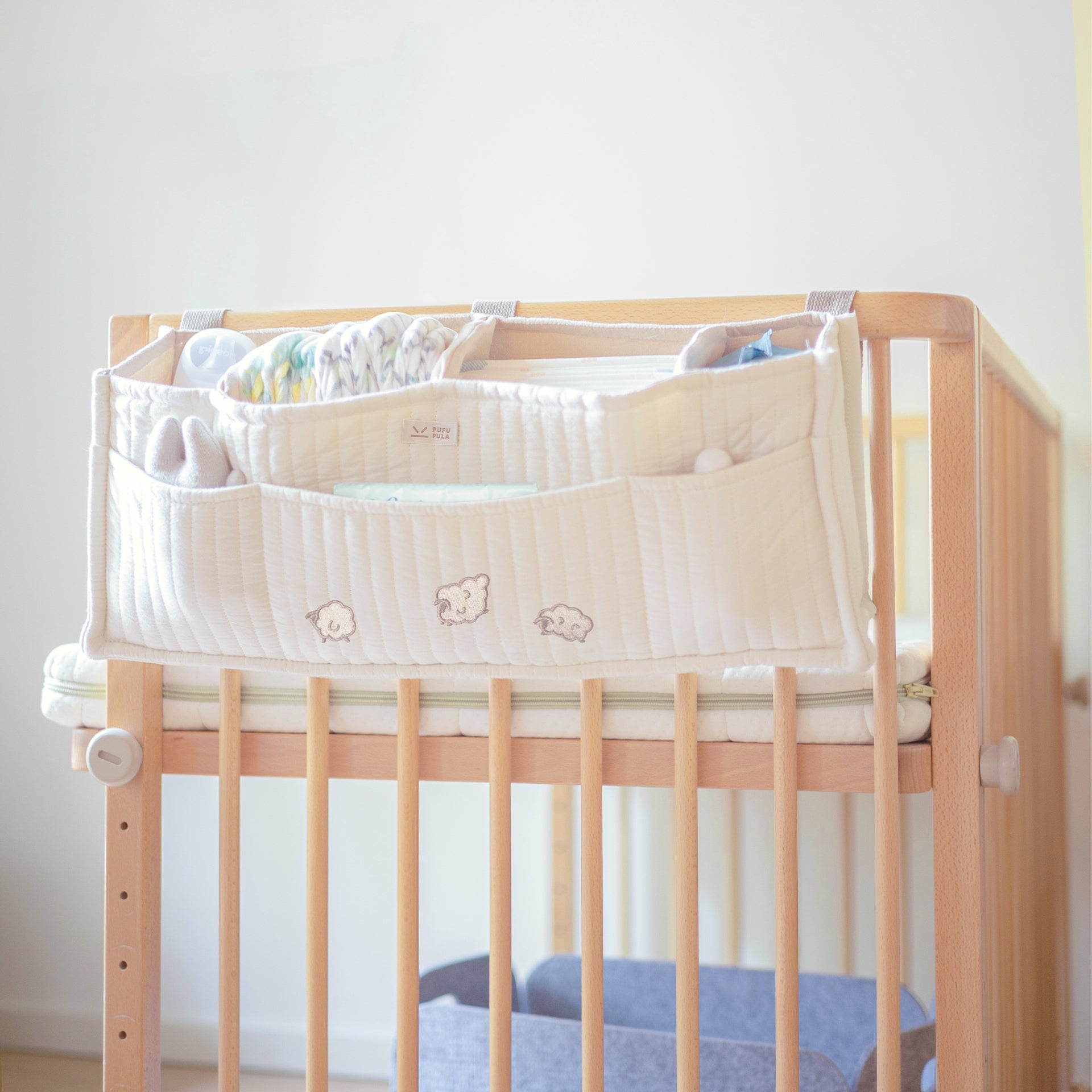 The bedside hanging bag is the best help for quick changes. Its clever pockets let you easily sort items like nappies, wipes, and bottles. Stop searching for essentials in the middle of the night, everything is visible and ready for a smooth, fast change.