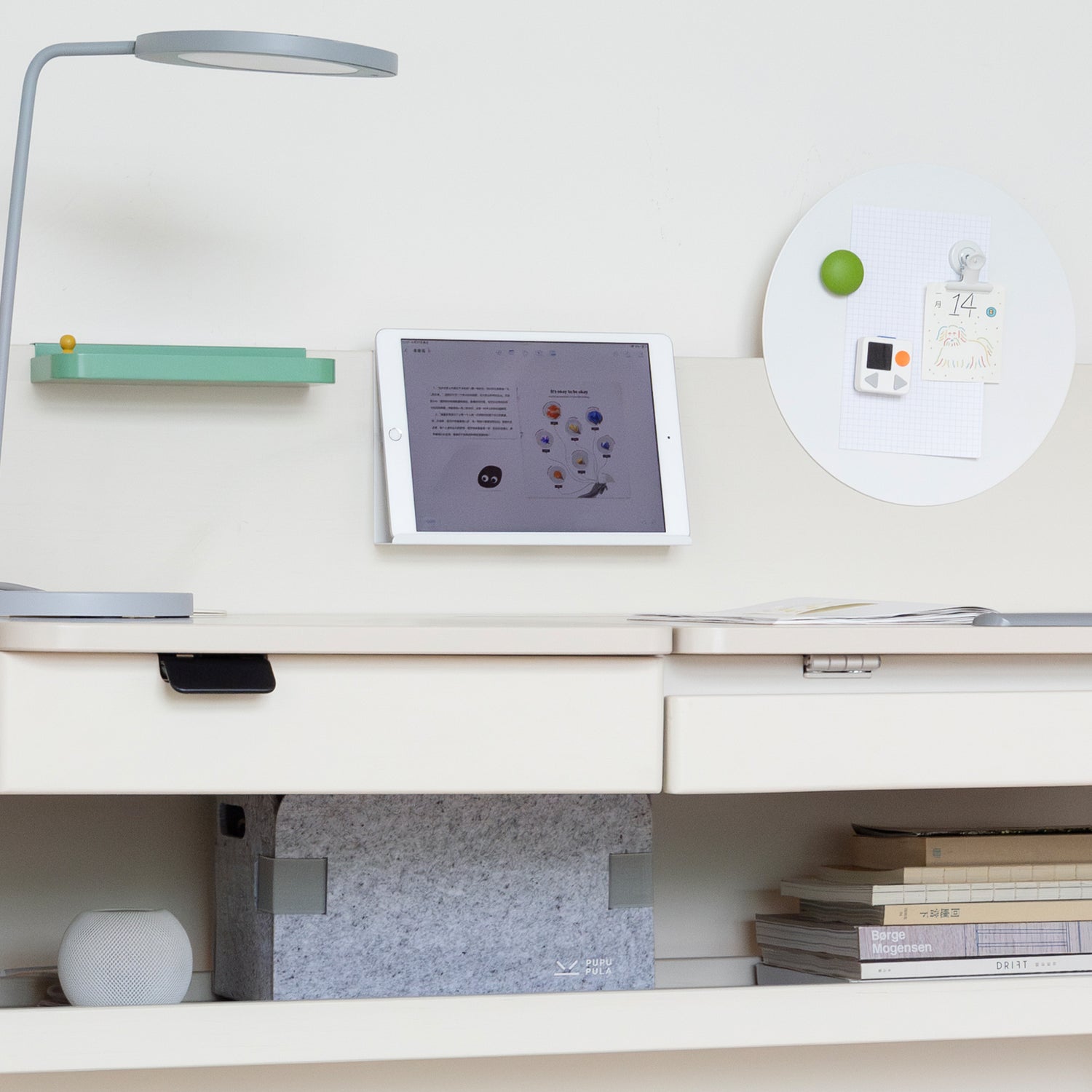 This clever organiser is all about maximising space. It can be mounted on either side of the desk's partitions to provide a convenient spot for books, papers, or small toys. Its double-sided design allows you to access items from both the inside and outside of the study space, helping to keep the desktop clear and organised.